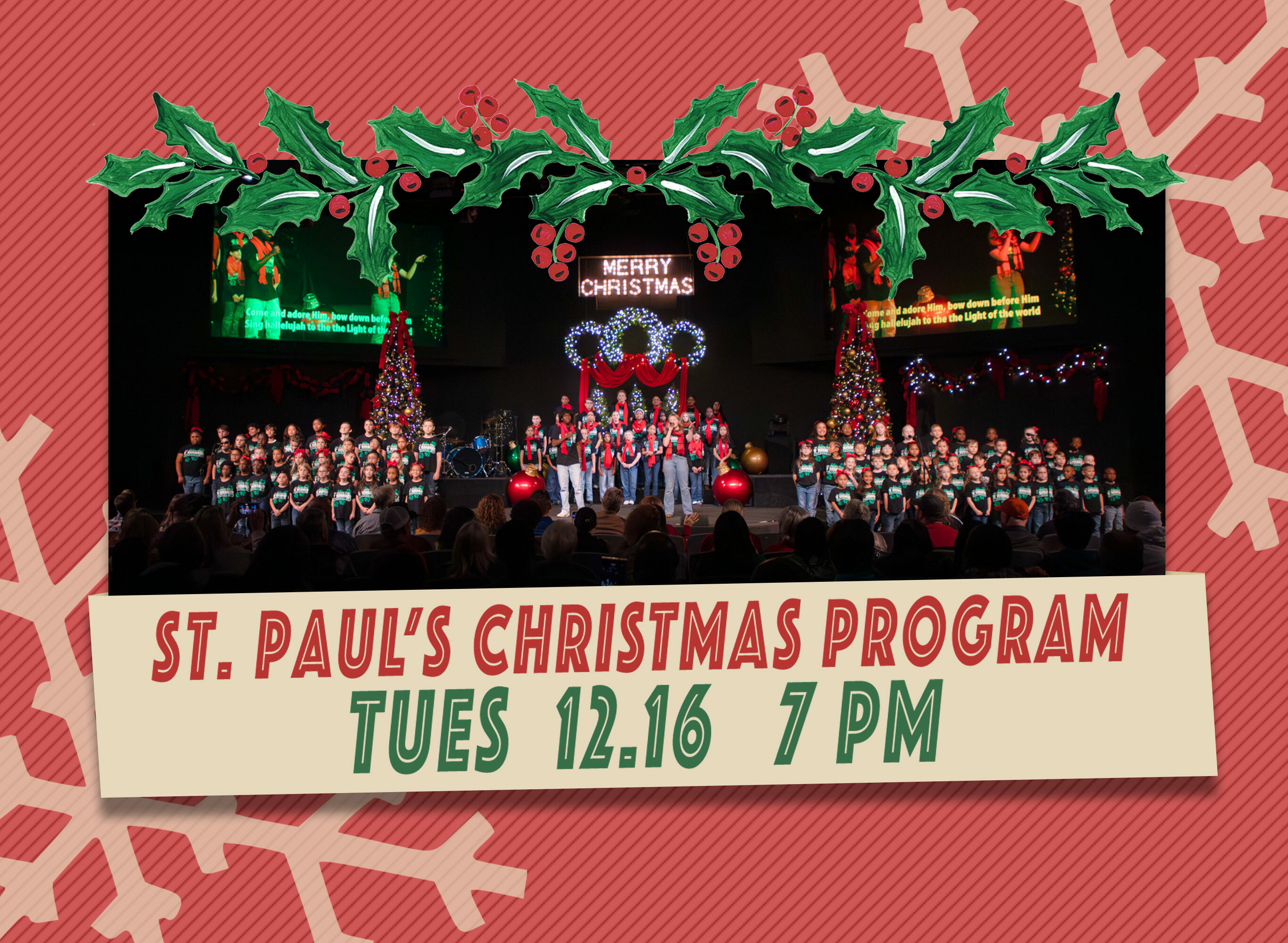 Mark your calendars for Tuesday, December 16th at 7 PM! The St. Paul’s Christmas program is a wonderful time to come and hear our students sing Christmas music and celebrate the Christmas season! It’s going to be a great night so bring your families to celebrate with us!